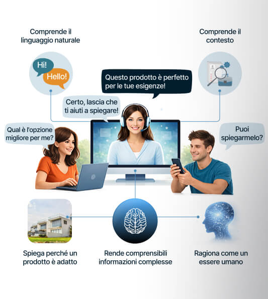 L’IA presenta immediatamente le opzioni più pertinenti e spiega in modo chiaro perché sono adatte a ogni situazione, migliorando il processo decisionale e l’esperienza del cliente.